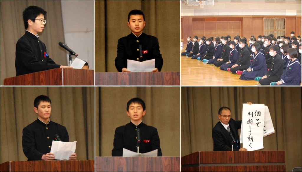 本日朝より、第3学期の始業式を行いました。3学期の抱負発表では、各学年の代表者3名と生徒会の代表者1名が発表しました。それぞれの立場で2学期までの成果や課題を踏まえ、これから実践することへの意気込みがうかがえる発表でした。特に3年生の代表者は、高校入試に向けて勉強を頑張っていることや、1、2年生のうちに部活動以外のことにも積極的に参加することの大切さなどを発表してくれました。これから本格的な受験シーズンを迎えます。3年生のみなさん、頑張ってください!!