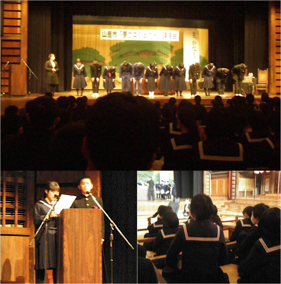 1月18日(水)14時より、八千代座において山鹿市内の中学2年生を対象とした山鹿市夢プロジェクト講演会が開催され、本校の2年生47名が参加しました。講演では、レーシングドライバーの方やプロデューサーの方にお越しいただき、これから夢を叶えるために頑張る生徒たちを励ましてくださいました。また、本校生徒会役員の2名が司会を務め、立派に役割を果たす姿を見ることもできました。