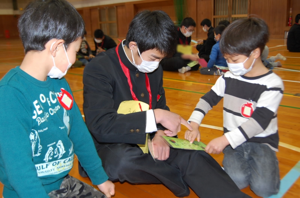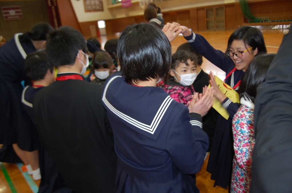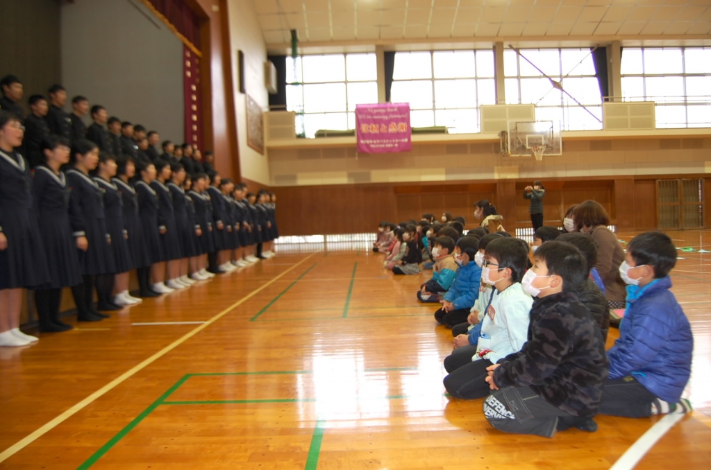 本日昼休みに3年生と園児にとって最後となる保育園との交流を行いました。園児からは元気な歌声、中学生からはきれいな歌声を贈りあいました。そのあと1年間交流してきた園児と中学生2~3人組に分かれて、お互いに作ってきたプレゼントを交換しました。