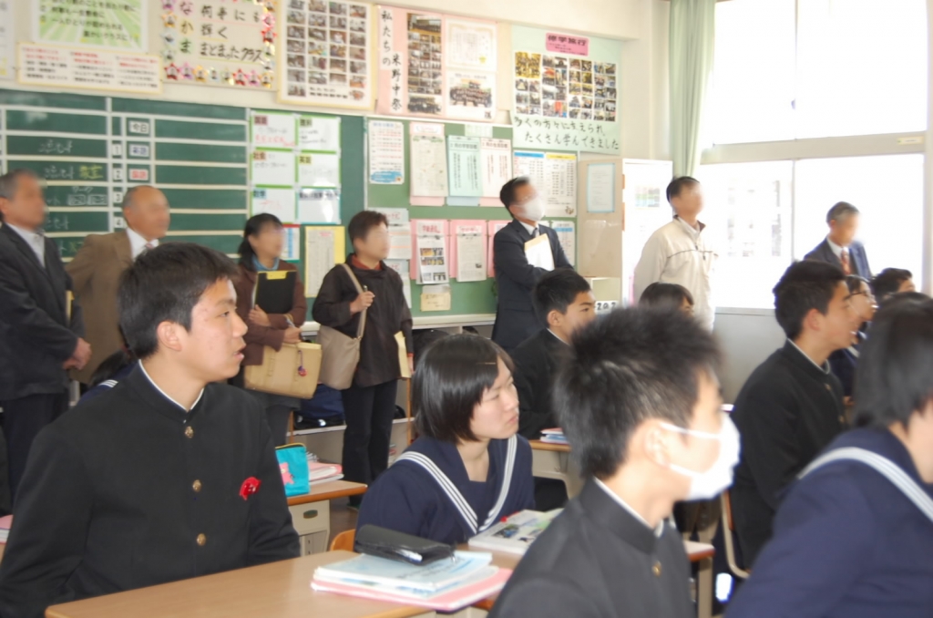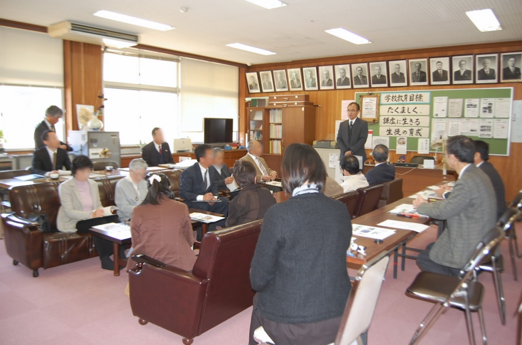 長崎県の東彼杵町より、教育委員会の教育長・事務局、4つの小・中学校の学校運営協議会委員の計13名が視察に来られました。コミュニティ・スクールを始められたばかりということで、コミュニティ・スクール等について熱心に質問をしていかれました。1年2組の数学、2年2組の英語の授業も参観され、生徒たちの授業態度などを褒めていただきました。