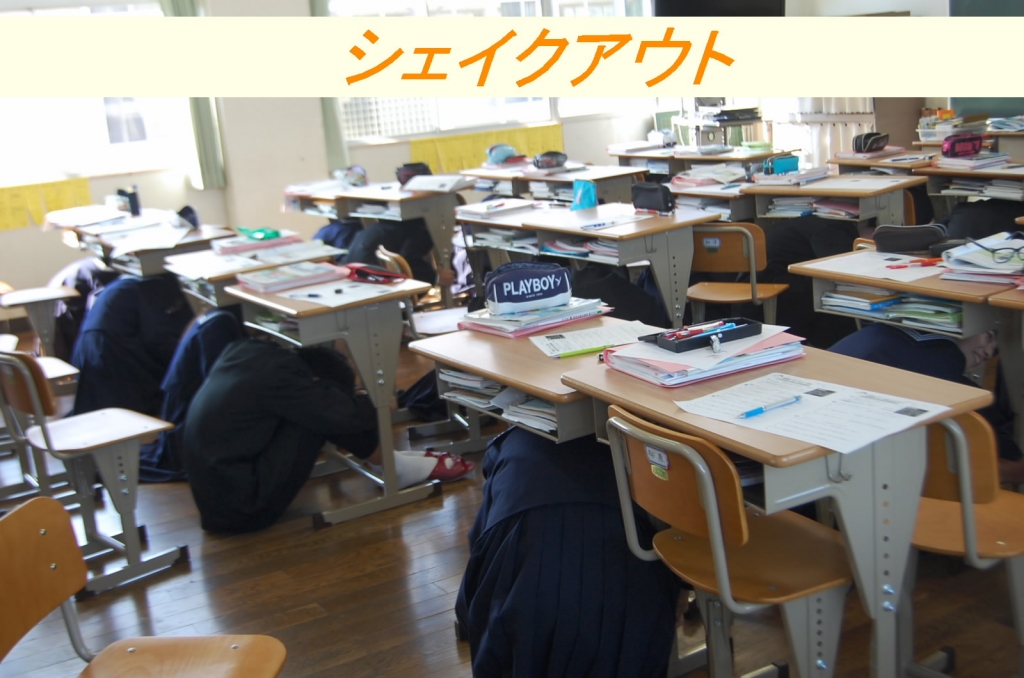 本日10時からの、熊本シェイクアウト訓練に本校も参加しました。防災無線での放送を聞き、机の下に潜るよう指示がありました。生徒たちは素早く机の下に隠れていました。