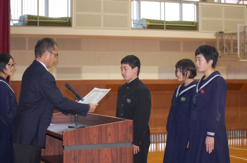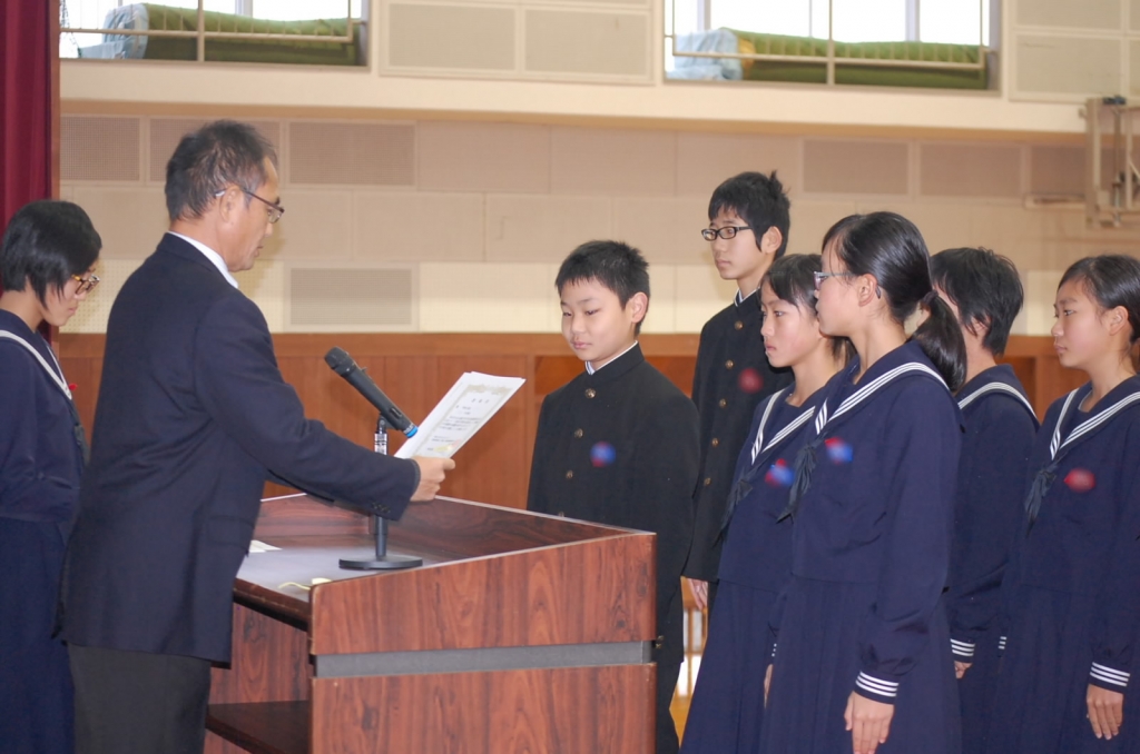 本日朝から全校集会を行いました。始めに表彰がありました。「税についての作文」、「文集なかまの意見文、詩歌」、「心のきずなを深めるポスター」、「美術展」、「読書感想画コンクール」、「英語暗唱大会」等22名の生徒が表彰を受け、米野中生の力を見られました。その後校長先生から修学旅行中の素晴らしい出会いや、本校2年生の学ぶ姿勢や行動が大変すばらしく感心したことについて話されました。