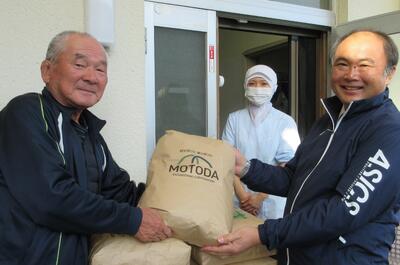 11月17日 元田工務店会長元田様から岱明町産の新米「にこまる」を約75kgいただきました。元田様は、山鹿市の子供たちの健全育成を支援するために、食に関するサポートをされていらっしゃいます。この度は市内の小中学校等に提供されるお米の中から、米野岳中学校分としてをいただきました。