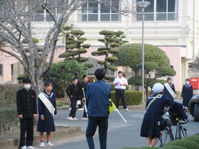 子供たちは、いつもと変わらぬ様子で登校してきましたが、正門付近からたくさんの大人の出迎えに少しびっくりしたり、はにかんだりしながらも、挨拶を交わして登校していました。