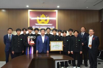 山鹿市長早田順一様と教育長堀田様から、県大会での頑張りをお褒めいただくとともに、九州大会での活躍を期待する激励のお言葉を頂戴しました。