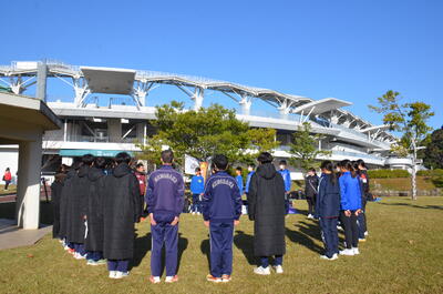 レース前に駅伝チームがそろって円陣を作り、目標を確認し合いました。ピーカンの清々しい朝です。