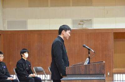 12月24日 第2学期の終業式を開きました。終業式では、それぞれの学年と生徒会の代表が、2学期の振り返りと3学期に寄せる抱負を語りました。