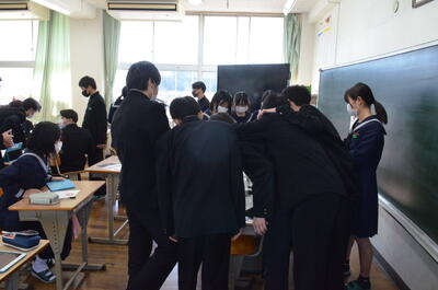 12月22日 2年生が理科の授業で、イカの解剖実験と観察をしていました。解剖用のはさみで胴体を開いて、各臓器の観察をしたり、目や口等の器官を取り出して詳しく調べたりしていました。