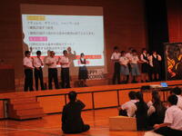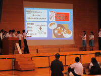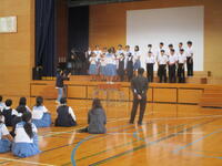 会の中では、新生徒会の四役(会長・副会長・書記・議長)7名が、新入生となる6年生児童とその保護者のみなさんに、三加和中の学校生活についてプレゼンテーションを行いました。