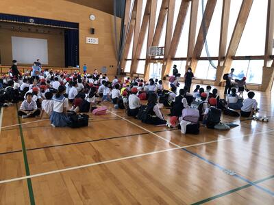 和水町民体育館で、町内4小中学校の生徒を対象に、もとサッカー日本代表の前園真聖さんと元Jリーガー原一樹さんから講話をしていただきました。サッカーボールを蹴っての交流なども行われ、盛り上がりました。前園さんからは『君たちが自分たちで自分たちの将来を決めていく。周りは決めない。自分で決めていくんです。』、原さんからは『夢や目標を語ること恥ずかしいことじゃない。仲間に伝えることで仲間が絶対に助けてくれる。』といったメッセージをいただきました。本校生徒もしっかりと話に聞き入り、手を上げて質問し、謝辞を述べてくれました。