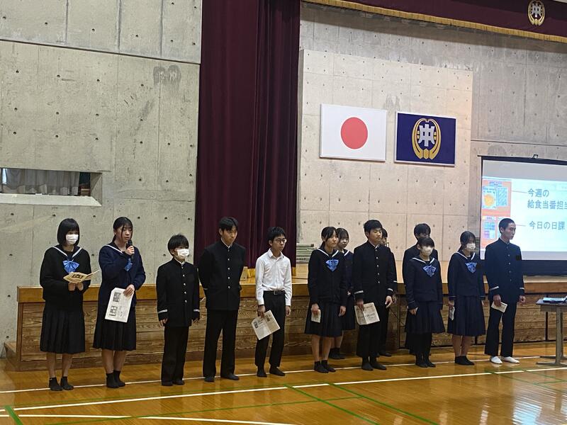 また、今日の放課後は生徒会主催の集会を行いました。執行部・学級委員会がアンケートによる二中生の実態の振り返り、給食委員会がクイズ形式での給食や給食センターの取り組みの紹介を行いました。こちらも2年生にバトンタッチです。