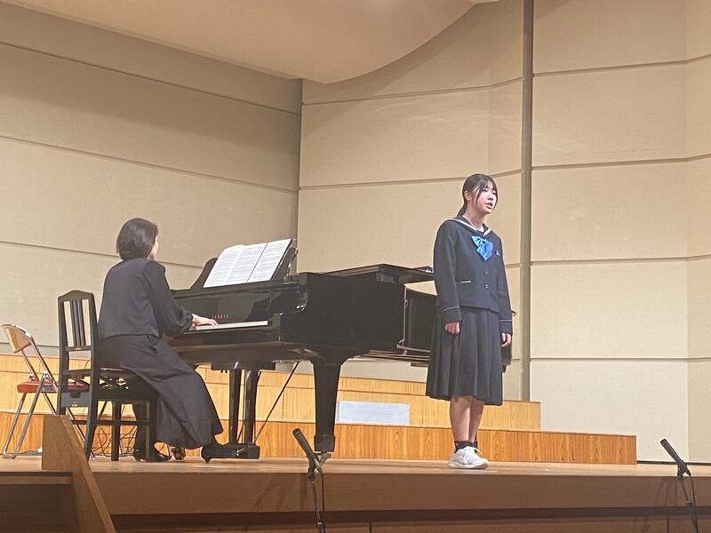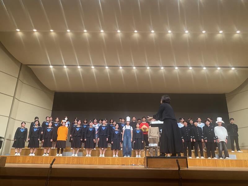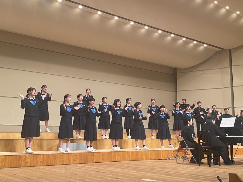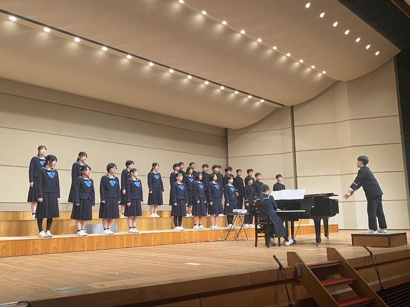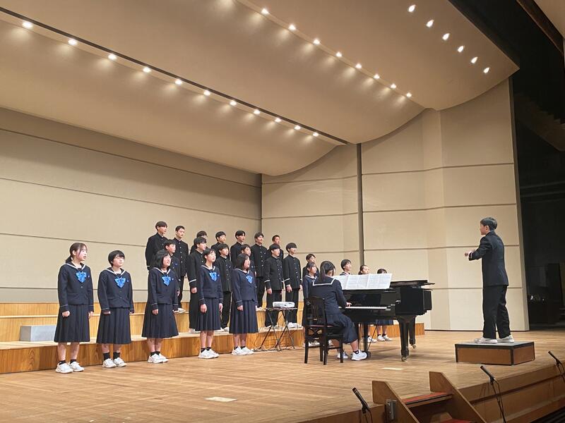 8月に開かれた「第92回NHK全国学校音楽コンクール熊本県コンクール」において、出場校から4校が選ばれる銀賞を受賞した、二中と一中の音楽部による合同合唱です。「空」と「風紋」を披露しました。2校のチームワークの良さで会場を魅了しました。