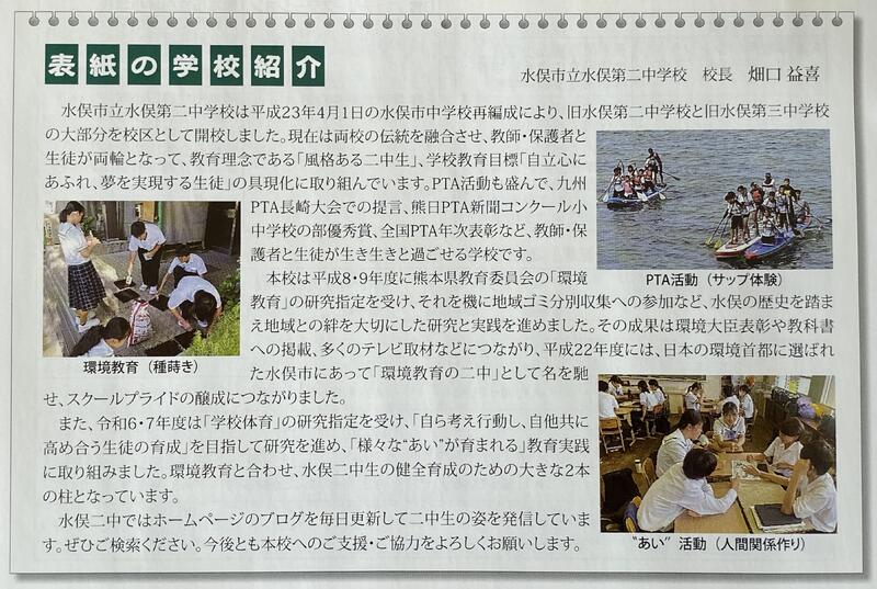 本校は平成8・9年度に熊本県教育委員会の「環境教育」の研究指定を受け、それを機に地域ゴミ分別収集への参加など、水俣の歴史を踏まえ地域との絆を大切にした研究と実践を進めました。その成果は環境大臣表彰や教科書への掲載、多くのテレビ取材などにつながり、平成22年度には日本の環境首都に選ばれた水俣市にあって「環境教育の二中」として名を馳せ、スクールプライドの醸成につながりました。