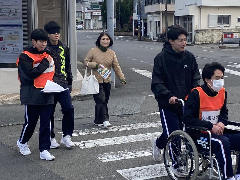 今日の3年生の福祉体験学習は「まちあるき体験」です。車椅子と目隠し、それぞれに介添えをつけて水俣市内の道路や商業施設を回りました。もう少し進むと、私の家族の転倒骨折現場です。ちょっとの段差もあぶないあぶない。