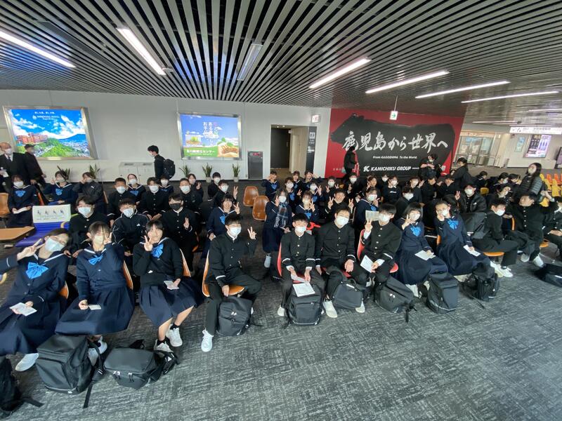 鹿児島空港に到着して、搭乗手続きを済ませました。この後、写真の飛行機に乗ります。T学年主任は苦手とする飛行機移動を前に緊張しています。