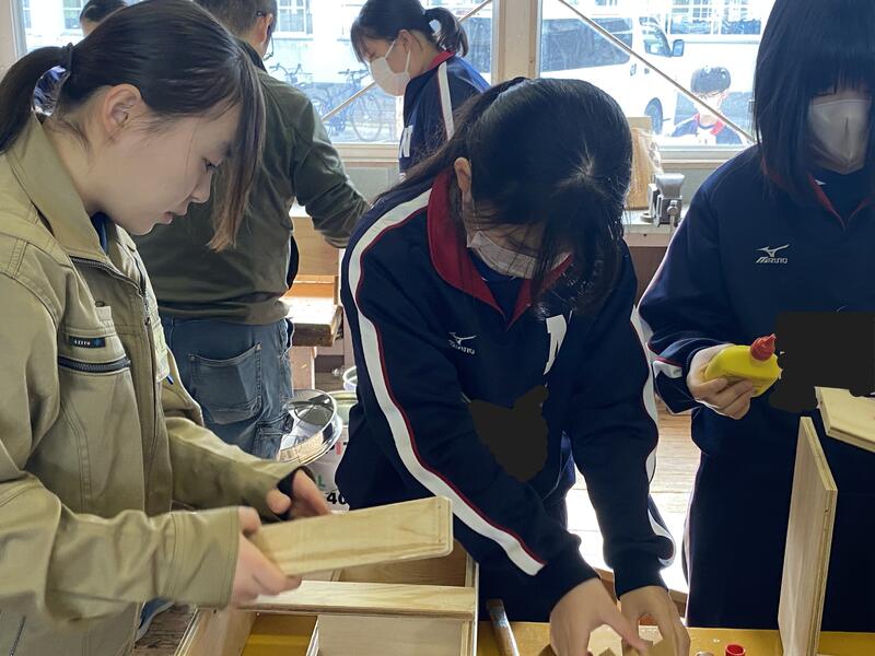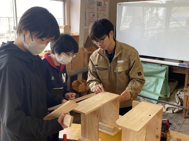 今日は水俣高校建築科2年生の皆さんに、技術の木材加工(マルチラック制作)の授業支援に来ていただきました。木材加工に興味を持った人はぜひ水俣高校建築科へ。