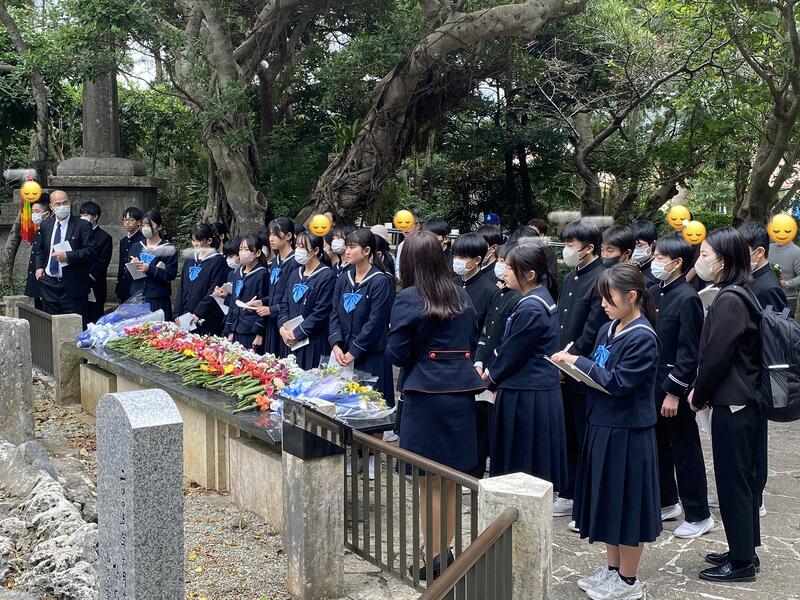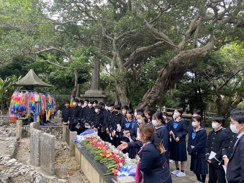 沖縄戦の体験と平和の尊さを伝えるため、ひめゆり同窓会によって設立された平和祈念資料館です。ひめゆりの塔の横で説明聞き、冥福をお祈りした後、証言映像や当時の写真、壕の実物大模型などが展示された資料館をじっくり見学しました。見学態度も真面目で、添乗員さんやガイドさんからも褒められています。