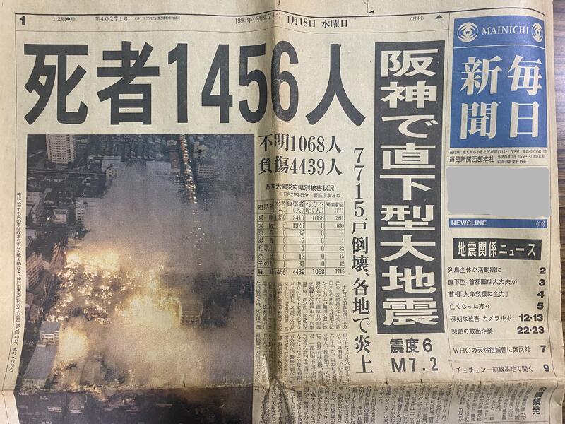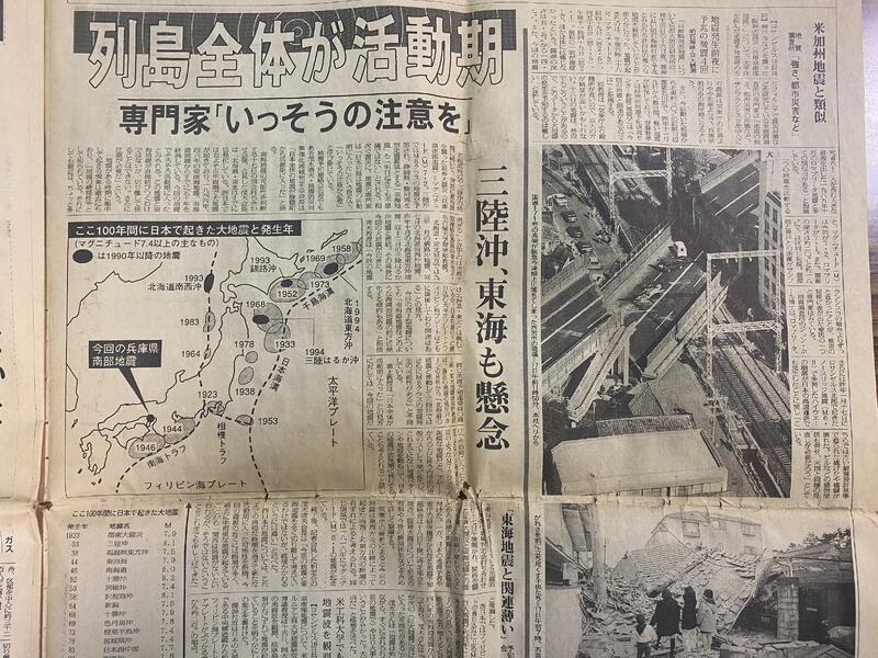 大きな出来事があったときの新聞を保存するようにしています。写真は阪神・淡路大震災の翌日、平成7年1月18日の新聞です。1面のトップは『死者1456名』『阪神で直下型大地震』『震度6・M7.2』、開くと横倒しになった阪神高速道路の高架の写真。被害の凄まじさが記録されています。