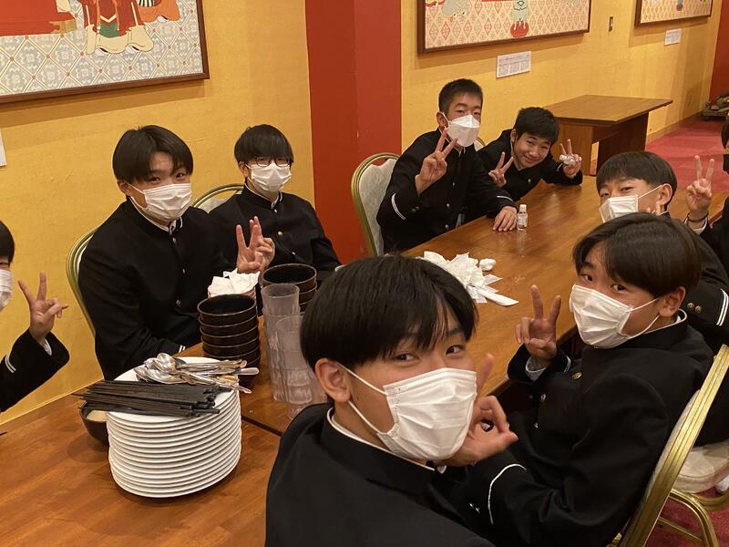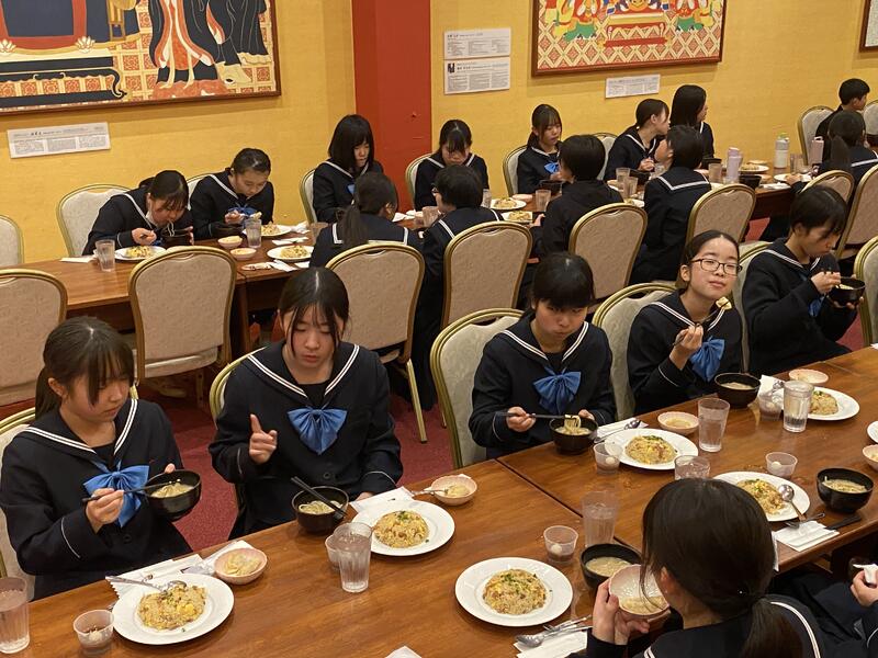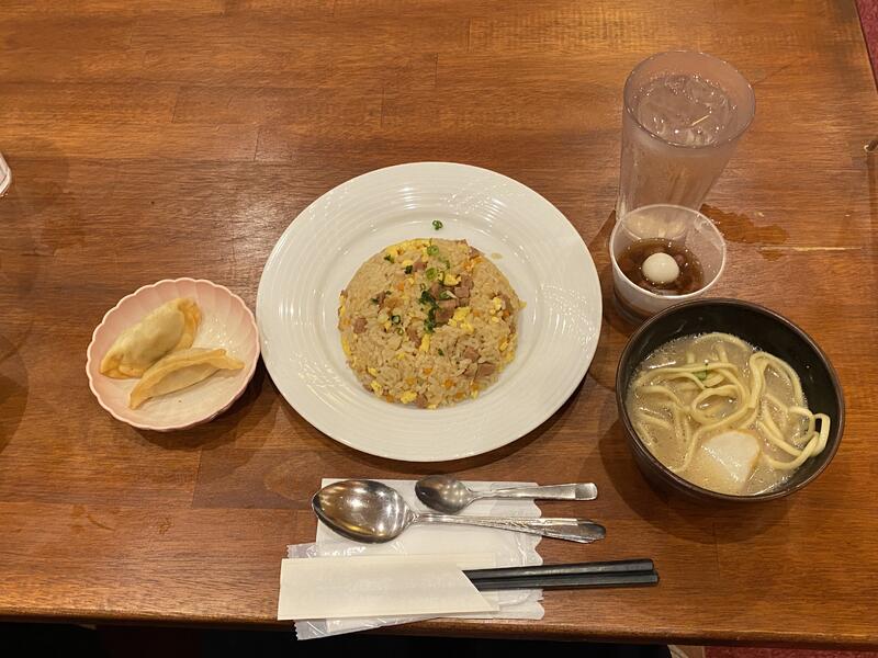 糸満市でお昼ご飯。メニューは沖縄そば、スパムの入った炒飯、餃子、ぜんざいです。子どもたちも満足です。