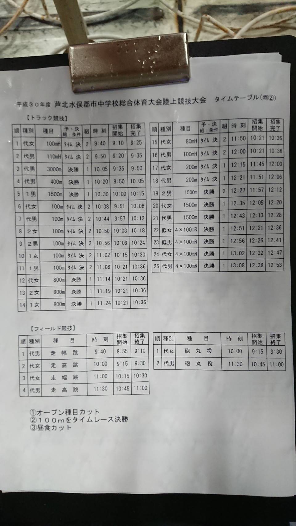 現時点では、100mをタイムレース決勝に、昼食時間をカットされます。オープン種目は全ての競技が終わり次第天候やグラウンドコンディションで実施が判断されるそうです。