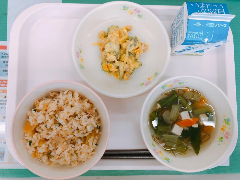 10月1日の給食は「チキンライス、牛乳て、わかめスープ、ごぼうサラダ」でした。