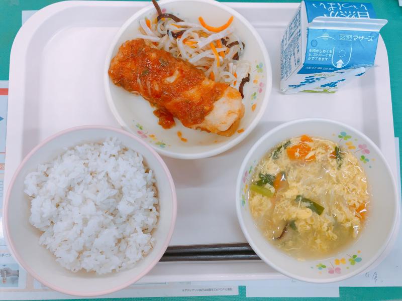 6月3日の給食は「麦ご飯、たまごスープ、いかのチリソースがけ、もやしの中華和え」でした。