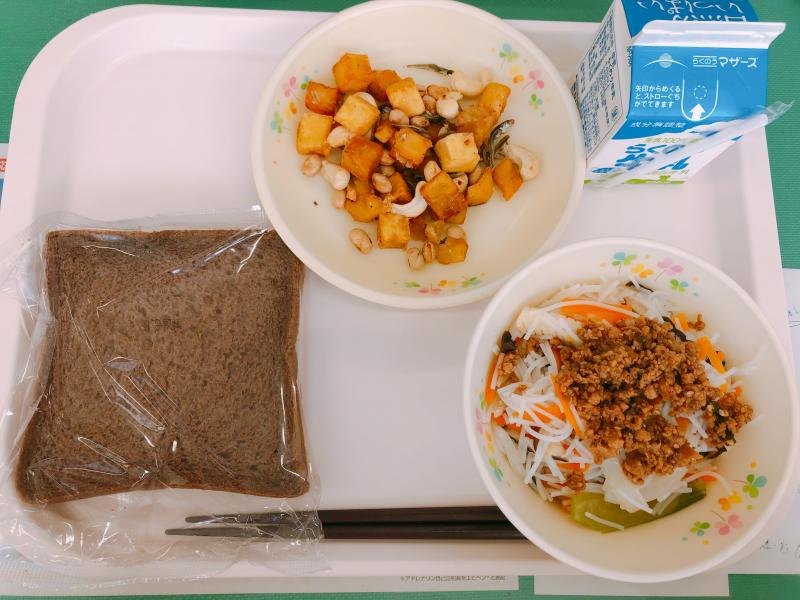 6月7日の給食は「ココアパン、牛乳、肉みそビーフン、ミックスかりんとう」でした。