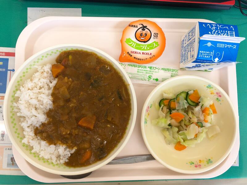 8月30日の給食は「夏野菜のカレーライス、牛乳、五分漬けあえ、フルーツムース」です。