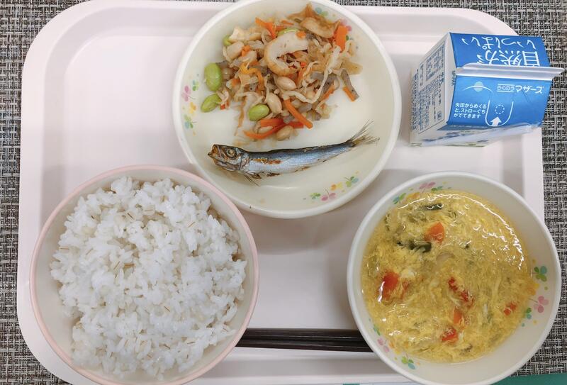 2月1日の給食は「麦ご飯、牛肉、かきたま汁、いわしの丸干し、切り干し大根のうま煮」でした。