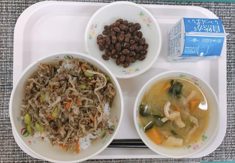 2月8日の給食は「シャキシャキそぼろ丼、牛乳、みそ汁、ココア豆」でした。