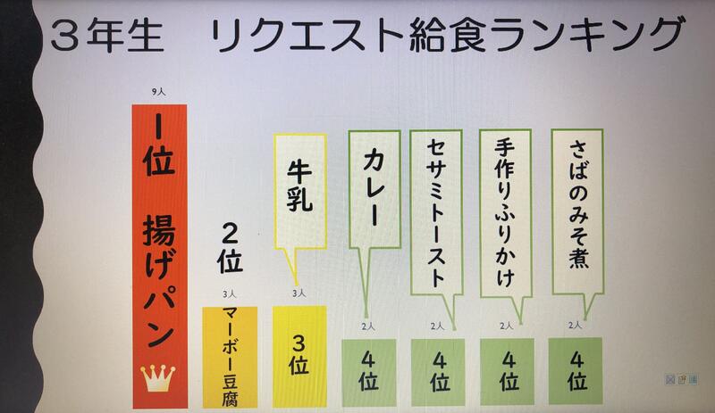 今日は『好きな給食ランキング』『先生方の給食の思い出』3年生編などの内容のスライドショーを流しました。