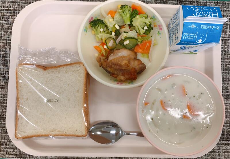 5月30日の給食は「食パン、牛乳、クリームスープ、鶏肉のマーマレード焼き、ブロッコリーサラダ」でした。