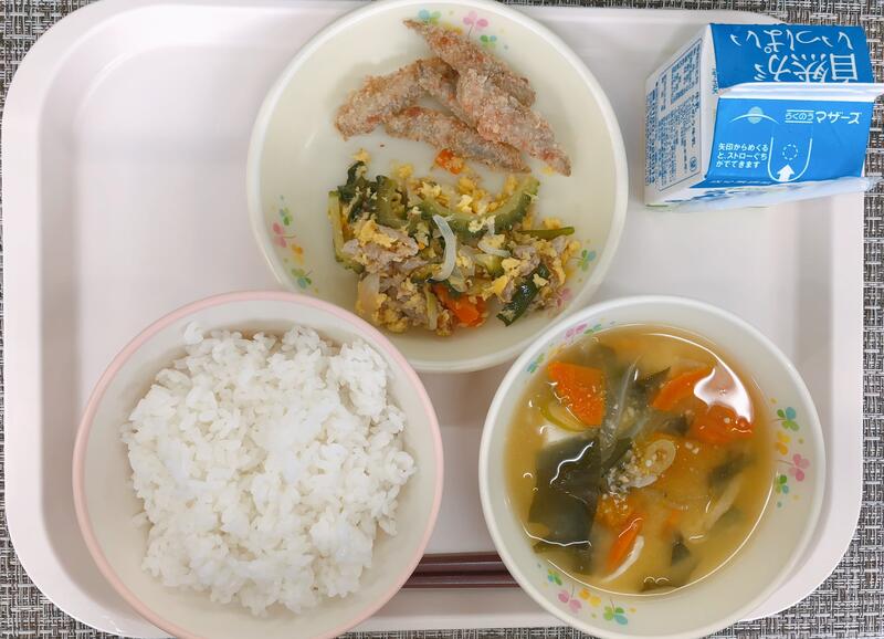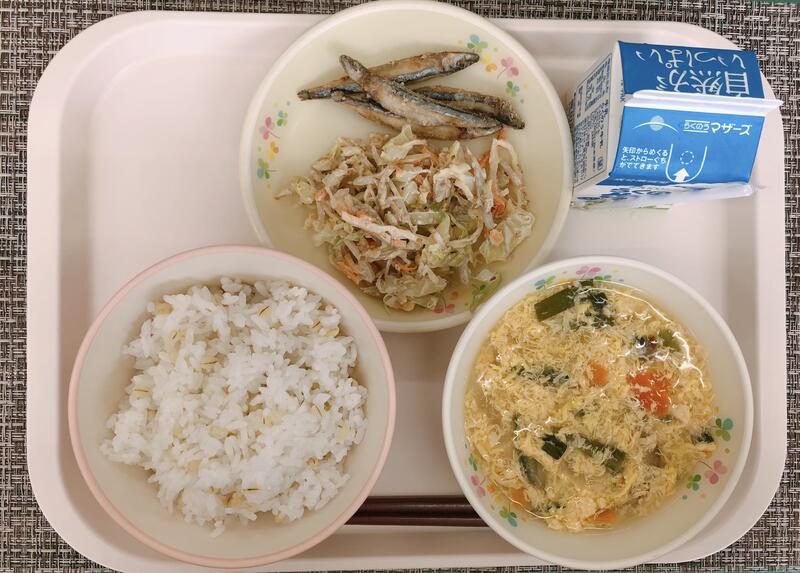 5月31日の給食は、「麦ごはん、牛乳、にら玉汁、きびなごのから揚げ、かみんこサラダ」でした。