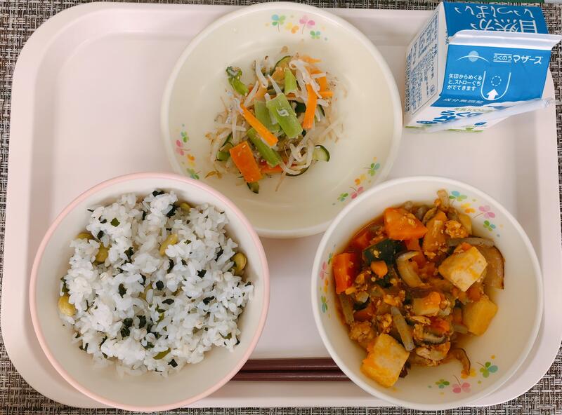 6月1日の給食は「枝豆ごはん、牛乳、かぼちゃのそぼろ煮、もやしのごま酢あえ」でした。