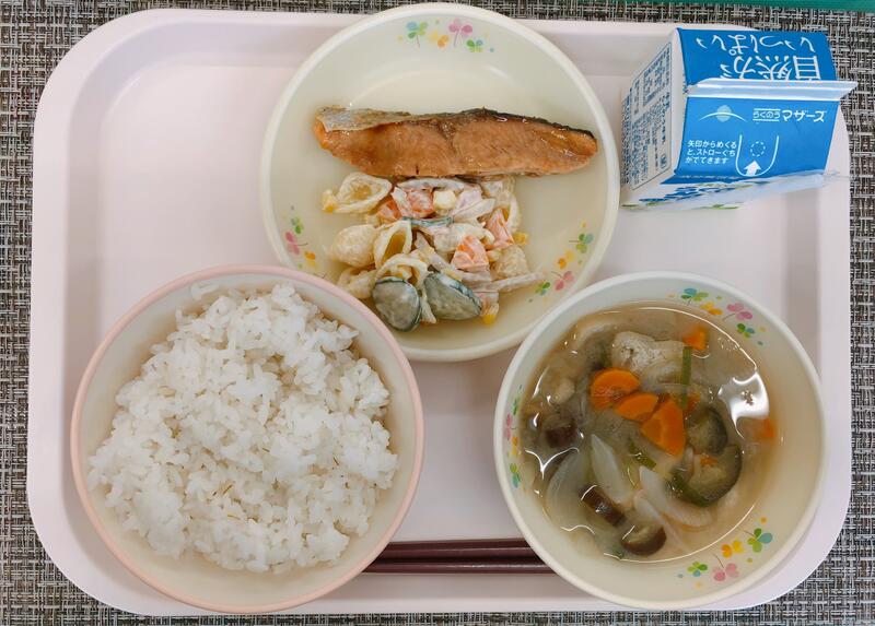 6月2日の給食は「麦ごはん、牛乳、なすのみそ汁、鮭のバター醤油焼き、マカロニサラダ」でした。
