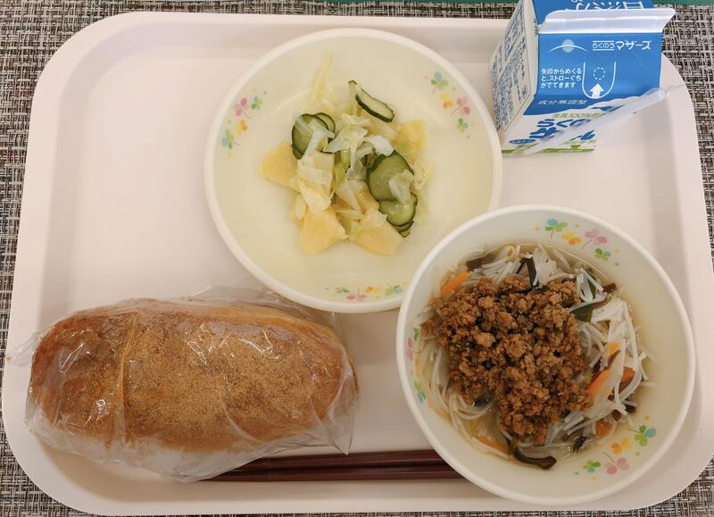 6月3日の給食は「きな粉揚げパン、牛乳、肉みそビーフン、キャベツとパインのサラダ」でした。