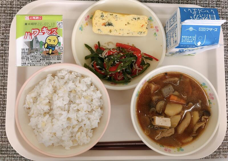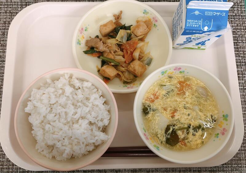 6月6日の給食は「麦ごはん、牛乳、かきたま汁、きゃべつと厚揚げの味噌炒め」でした。
