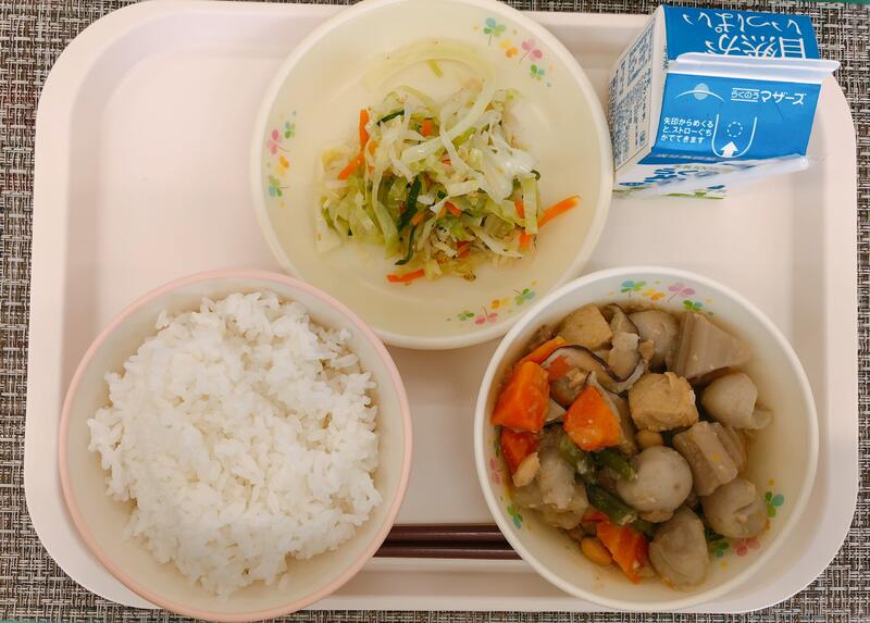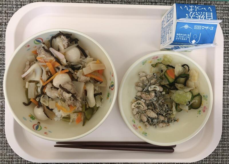 6月7日の給食は「ごはん、牛乳、大豆入り筑前煮、たくあんの香りあえ」でした。