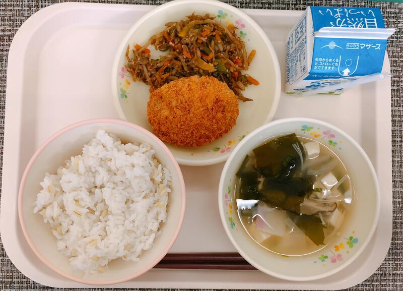 6月8日の給食は「麦ごはん、牛乳、豆腐のすまし汁、牛肉コロッケ、洋風きんぴら」でした。