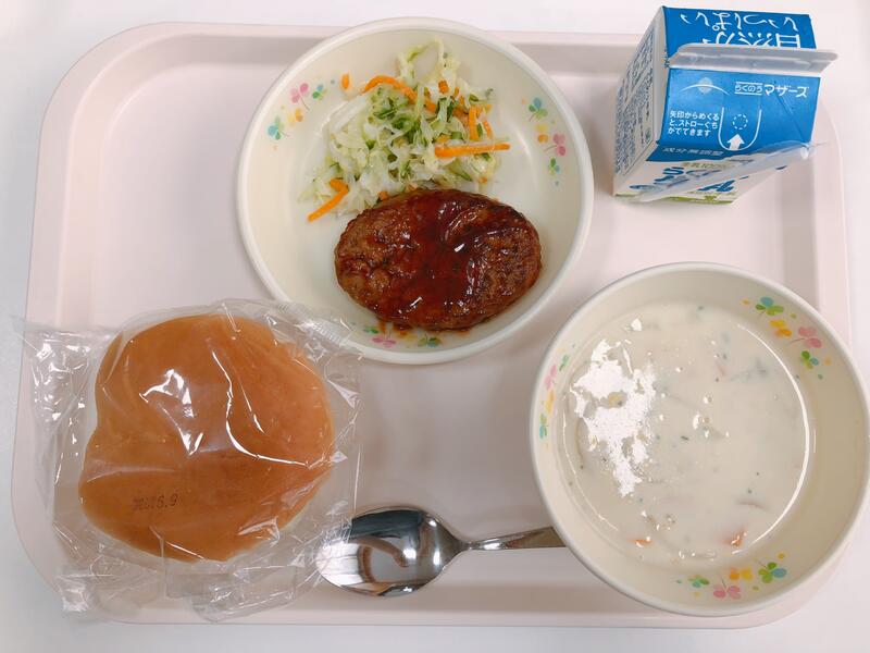 6月10日の給食は「セルフバーガー、牛乳、つぶつぶコーンスープ、コールスロー」でした。