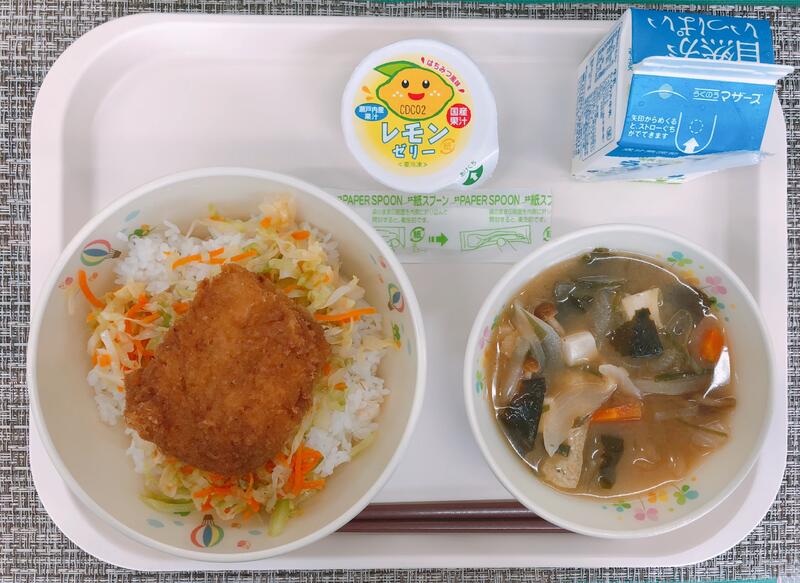 6月22日の給食は「ソースカツ丼、牛乳、なめこのみそ汁、レモンゼリー」でした。