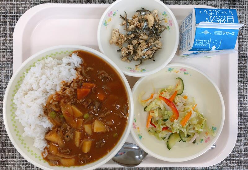 10月25日の給食は「ビーフカレーライス、牛乳、甘夏サラダ」でした。