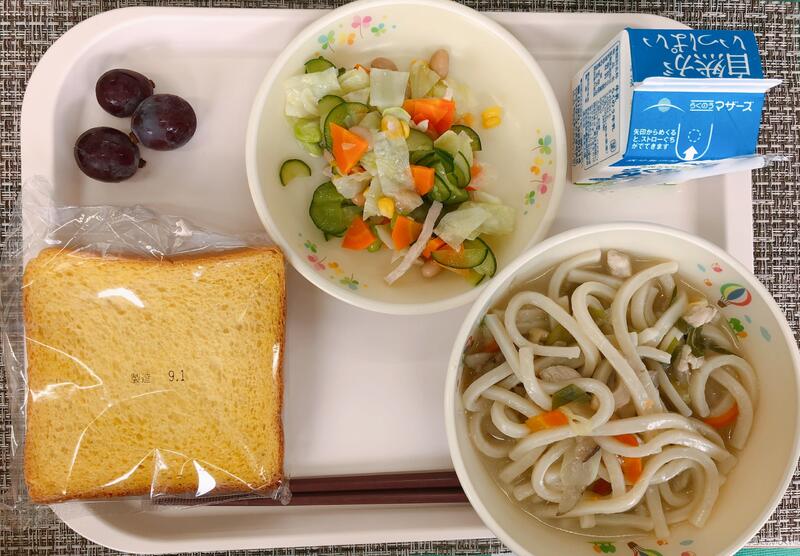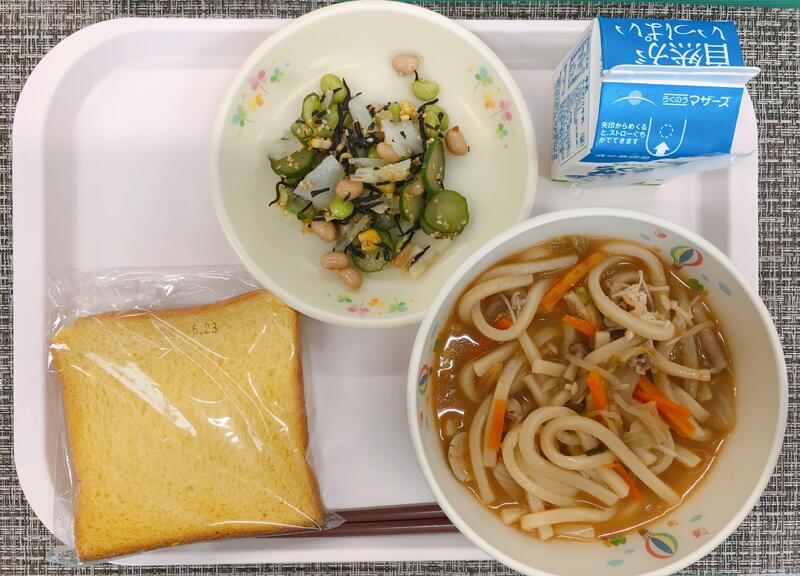 6月24日の給食は「米粉入り人参パン、牛乳、キムチ鍋うどん、まめまめサラダ」でした。