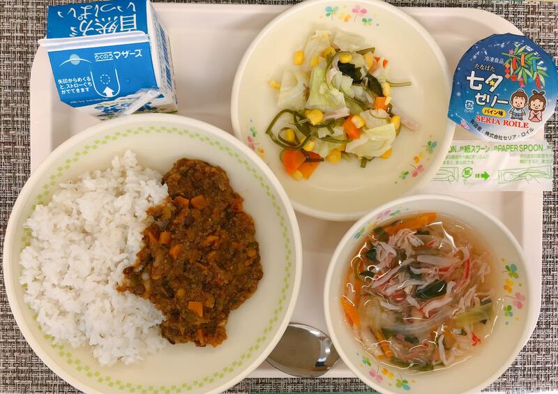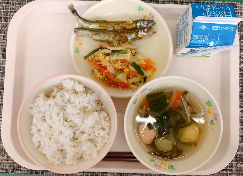 6月27日の給食は「麦ご飯、牛乳、もずくスープ、ししゃものカレー焼き、卵と春雨の炒め物」でした。