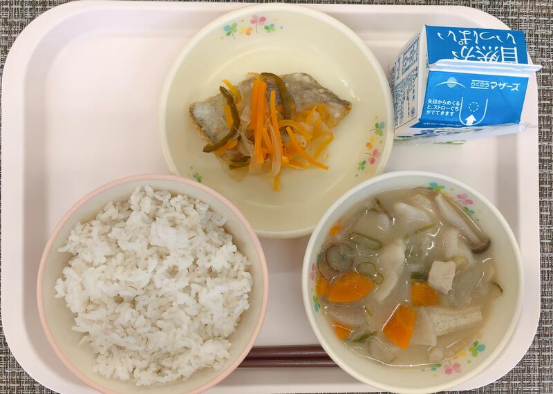 10月19日の給食は「ごはん、牛乳、しょうが団子汁、鯛の塩焼き、れんこんサラダ」でした。