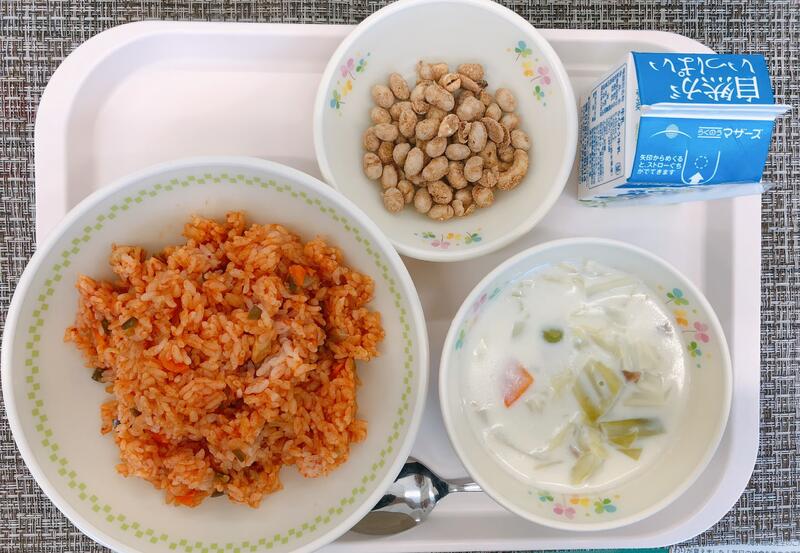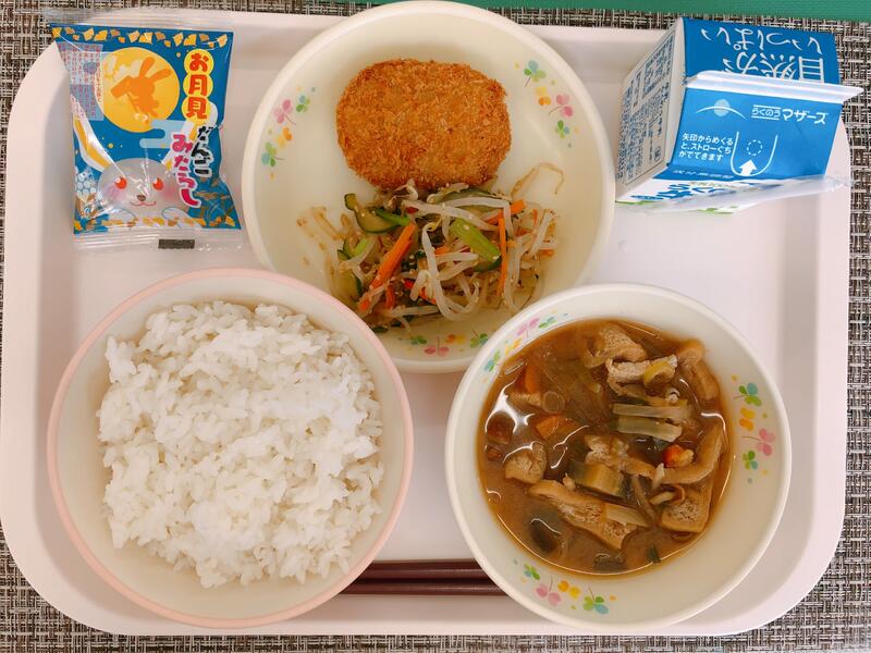 10月21日の給食は「こぎつねごはん、牛乳、なめこのみそ汁、まめまめサラダ」でした。