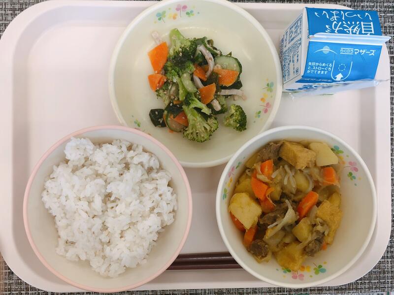 10月26日の給食は「麦ご飯、いかとさといもの煮物、ブロッコリーのごま酢あえ」でした。
