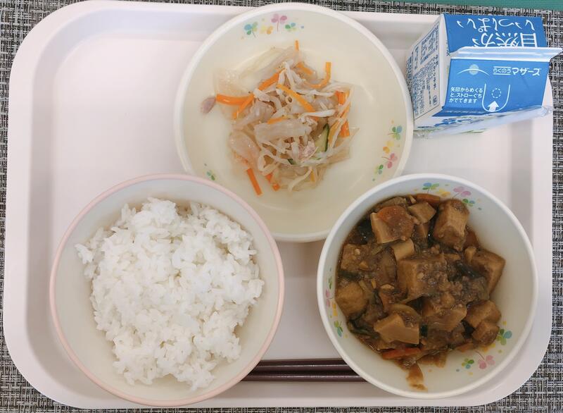 10月18日の給食は「麦ご飯、牛乳、厚揚げときのこの酸辣湯、春巻き、バンサンスー」でした。