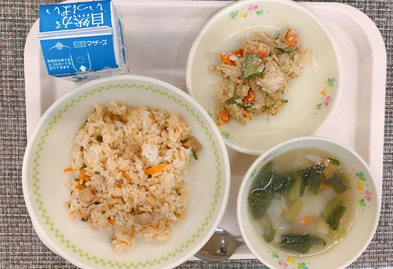10月24日の給食は「カミカミ高菜めし、牛乳、もずくスープ、カラフルかぼちゃサラダ」でした。