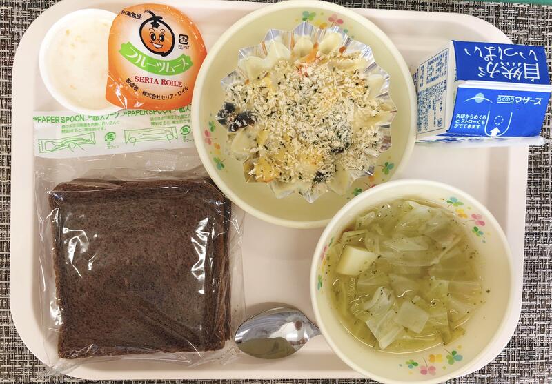 10月17日の給食は「セルフフルーツクリームサンド、牛乳、野菜スープ、トマトオムレツ」でした。